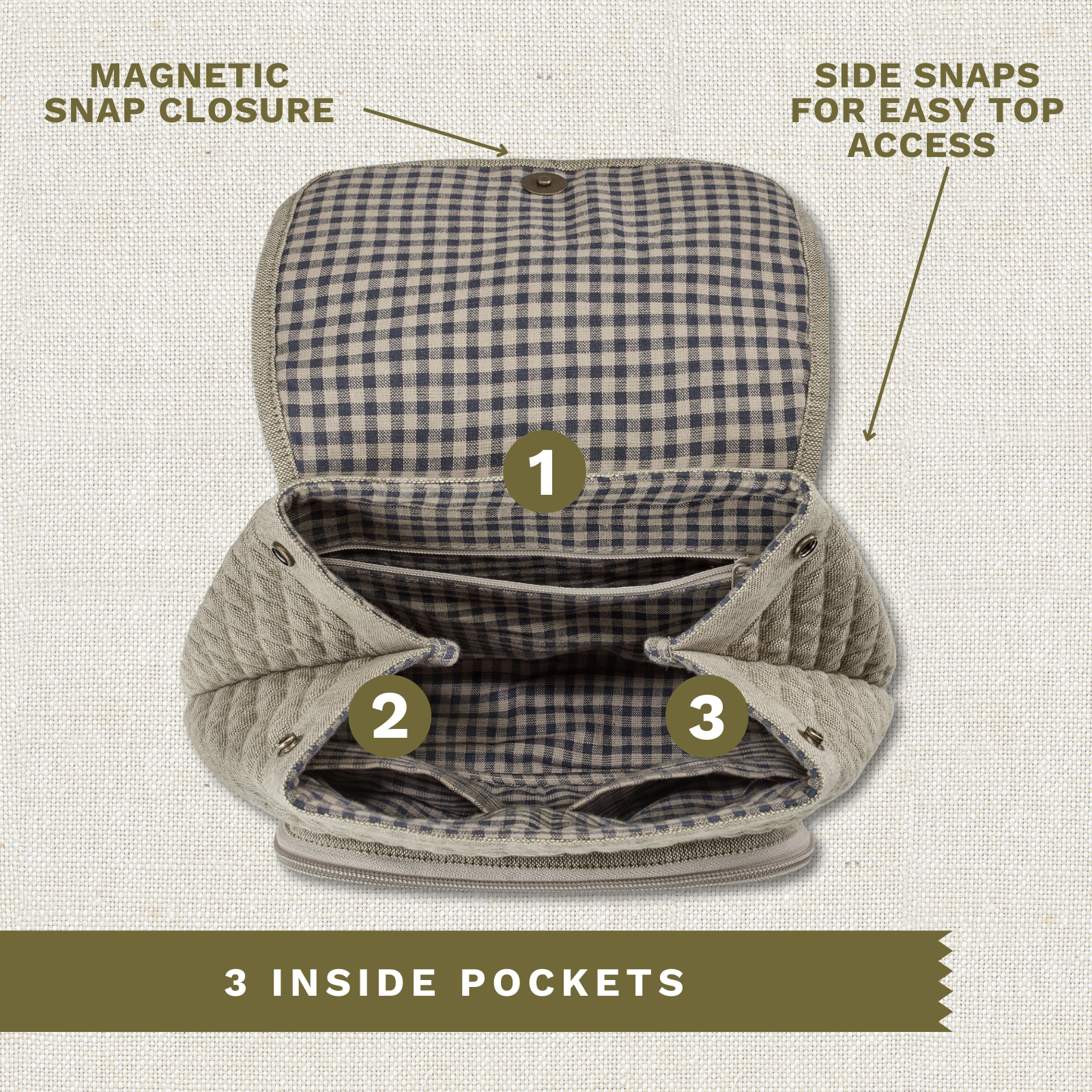 Multiple Pockets for Smart Organization: Six compartments include 1 interior zip, 2 interior slip pockets, a back slip pocket, and a front zip pocket with internal slip for phone or keys. Magnetic snap closure keeps items secure.