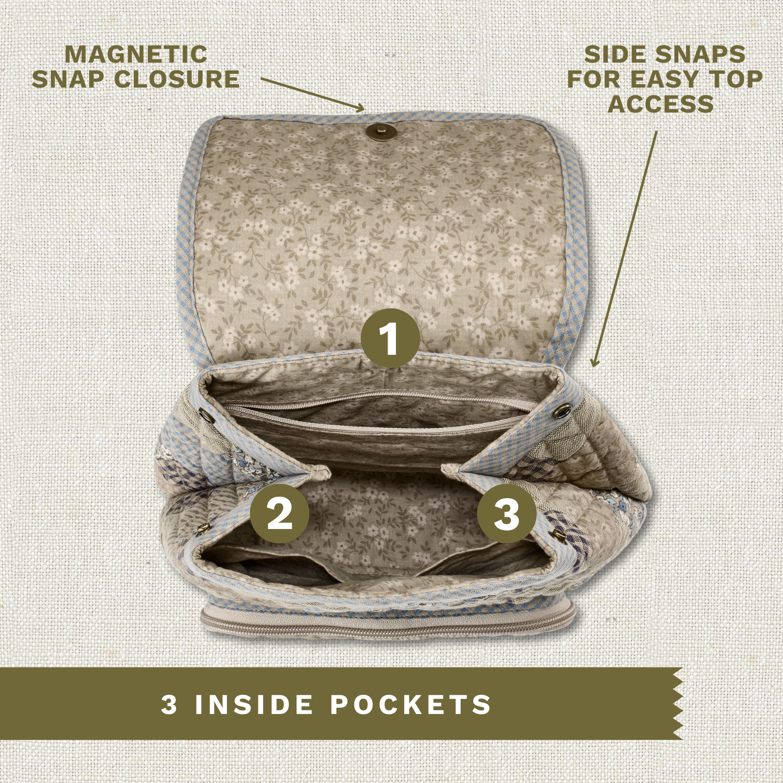 Multiple Pockets for Smart Organization: Six compartments include 1 interior zip, 2 interior slip pockets, a back slip pocket, and a front zip pocket with internal slip for phone or keys. Magnetic snap closure keeps items secure.