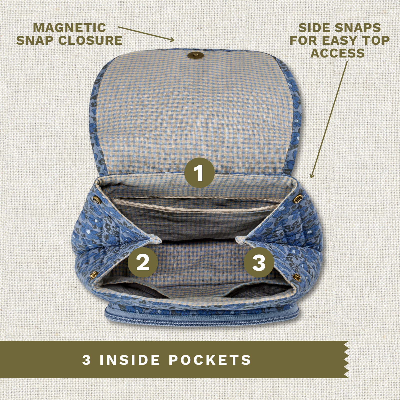 Multiple Pockets for Smart Organization: Six compartments include 1 interior zip, 2 interior slip pockets, a back slip pocket, and a front zip pocket with internal slip for phone or keys. Magnetic snap closure keeps items secure.