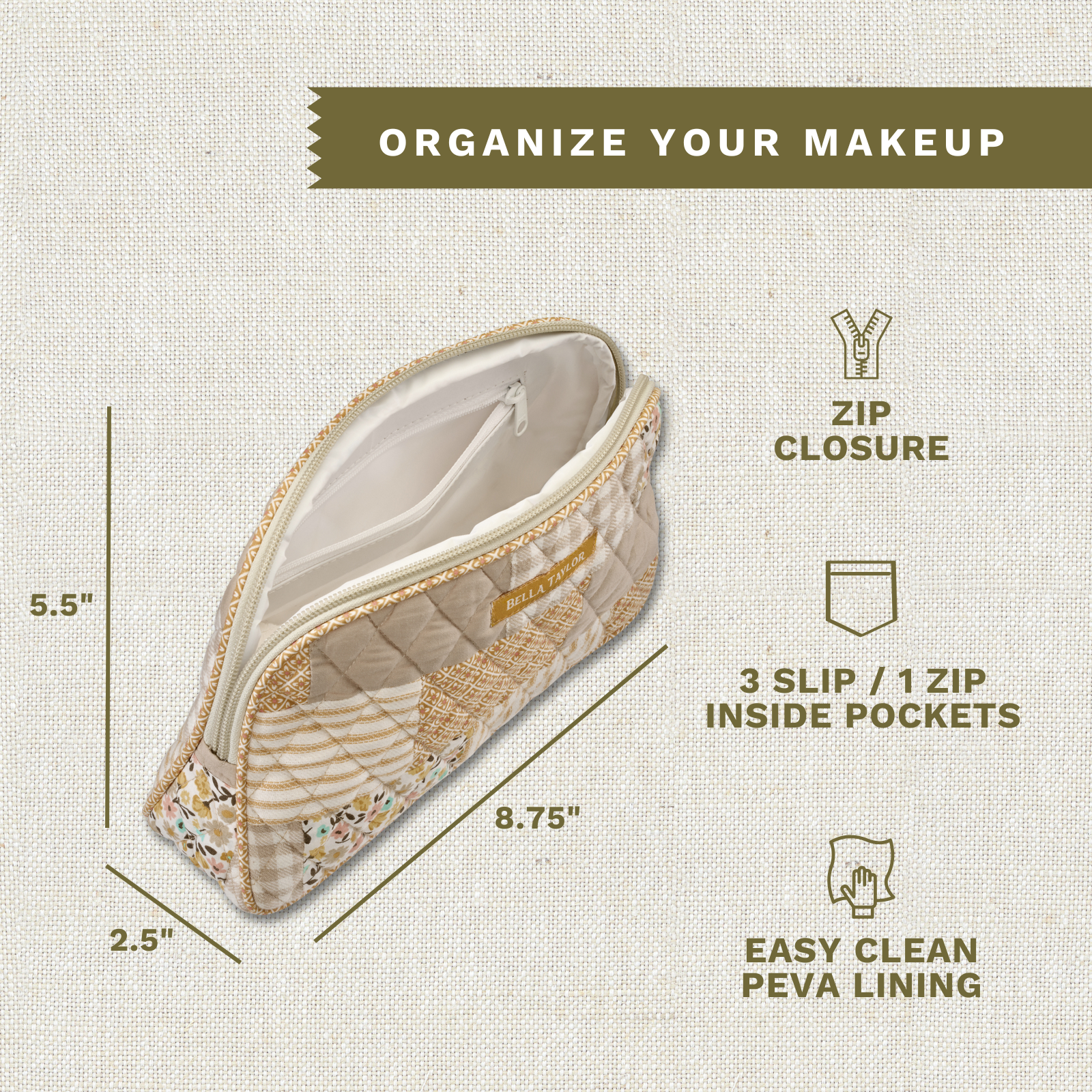 Organizer Pouch: This quilted pouch has 3 slip pockets, 1 zip pocket, and a wide main compartment to organize all of your toiletries and cosmetics. Never lose your eyeliner again! Also great as a pouch supplies, chargers, and electronics.